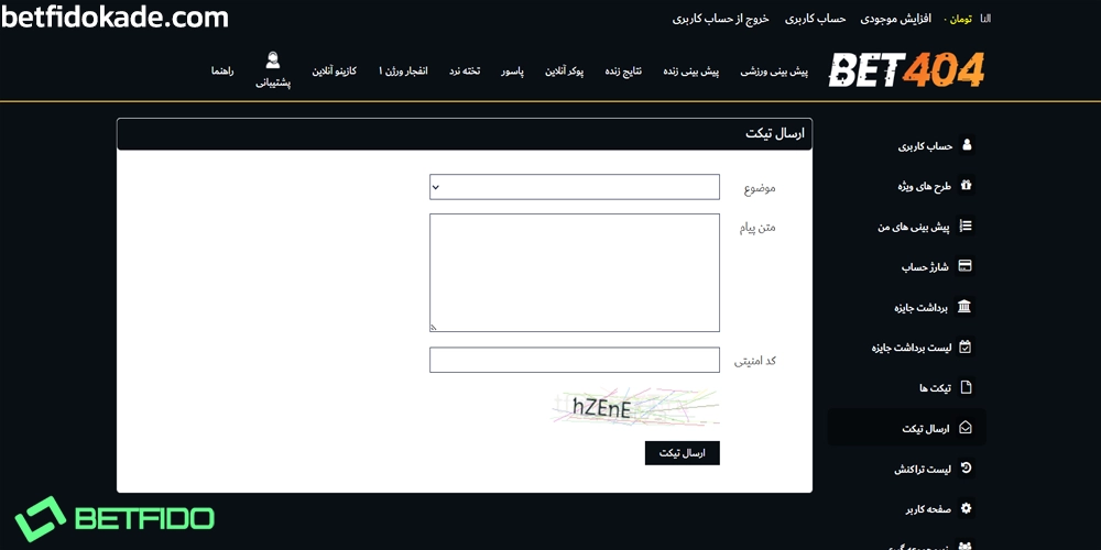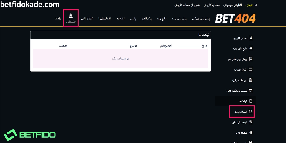 پشتیبانی در سایت بت 404 از طریق ارسال تیکت انجام می شود. این روش باعث می شود ارتباط کاربران با تیم فنی و پشتیبانی کاملا دقیق، مستند و قابل پیگیری باشد. برای ارسال تیکت کافی است مراحل زیر را طی کنید: